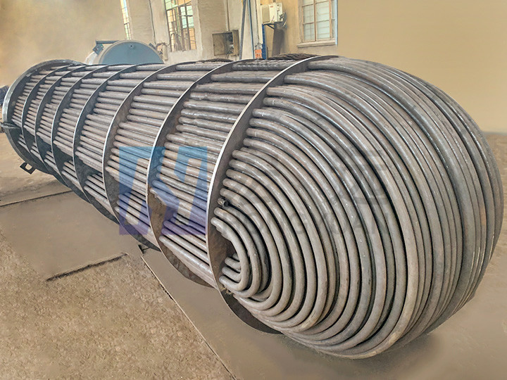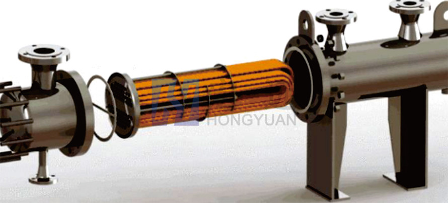 U形管式換熱器,每根管子都彎成U形,兩端固定在同一塊管板上,每根管子皆可自由伸縮,從而解決熱補償問題。管程至少為兩程,管束可以抽出清洗,管子可以自由膨脹。其結(jié)構(gòu)簡單,質(zhì)量輕,適用于高溫高壓條件。